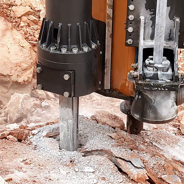 PL1000巖石鉆裂一體機,25噸挖機加裝,鉆孔和劈裂一體施工,單孔鉆裂約4分鐘,孔徑115mm、孔深1.6m,單孔約1.5~2立方